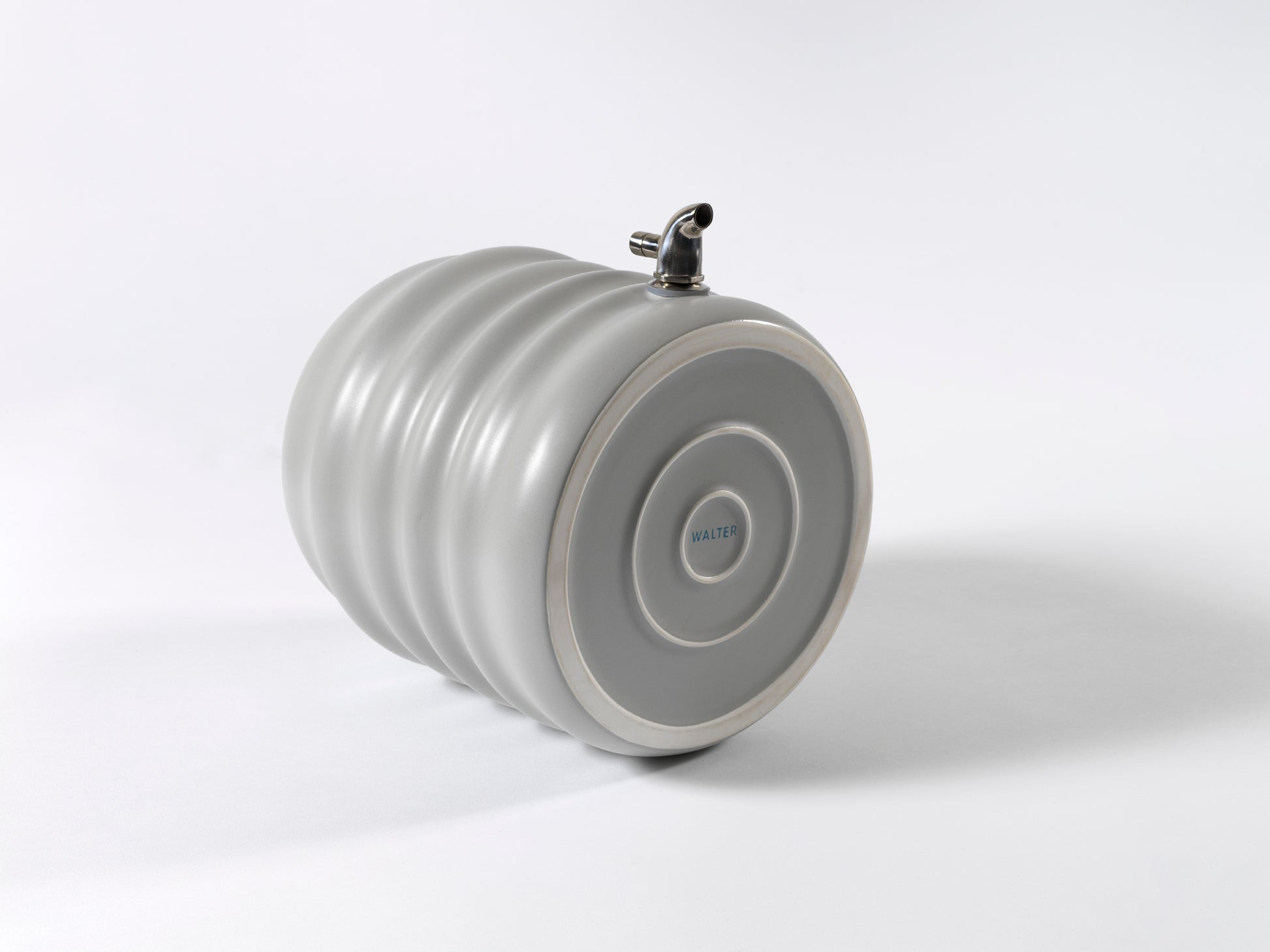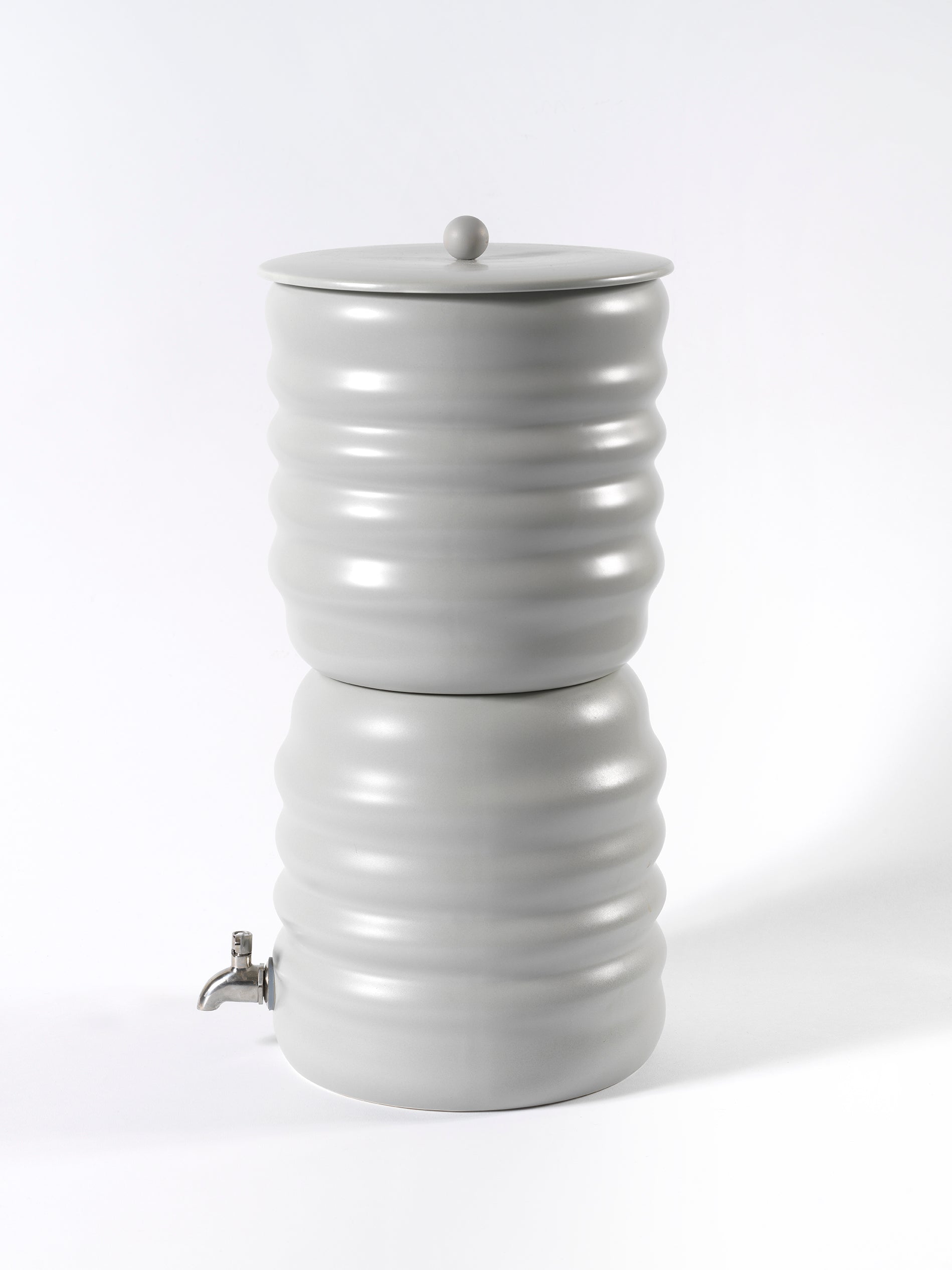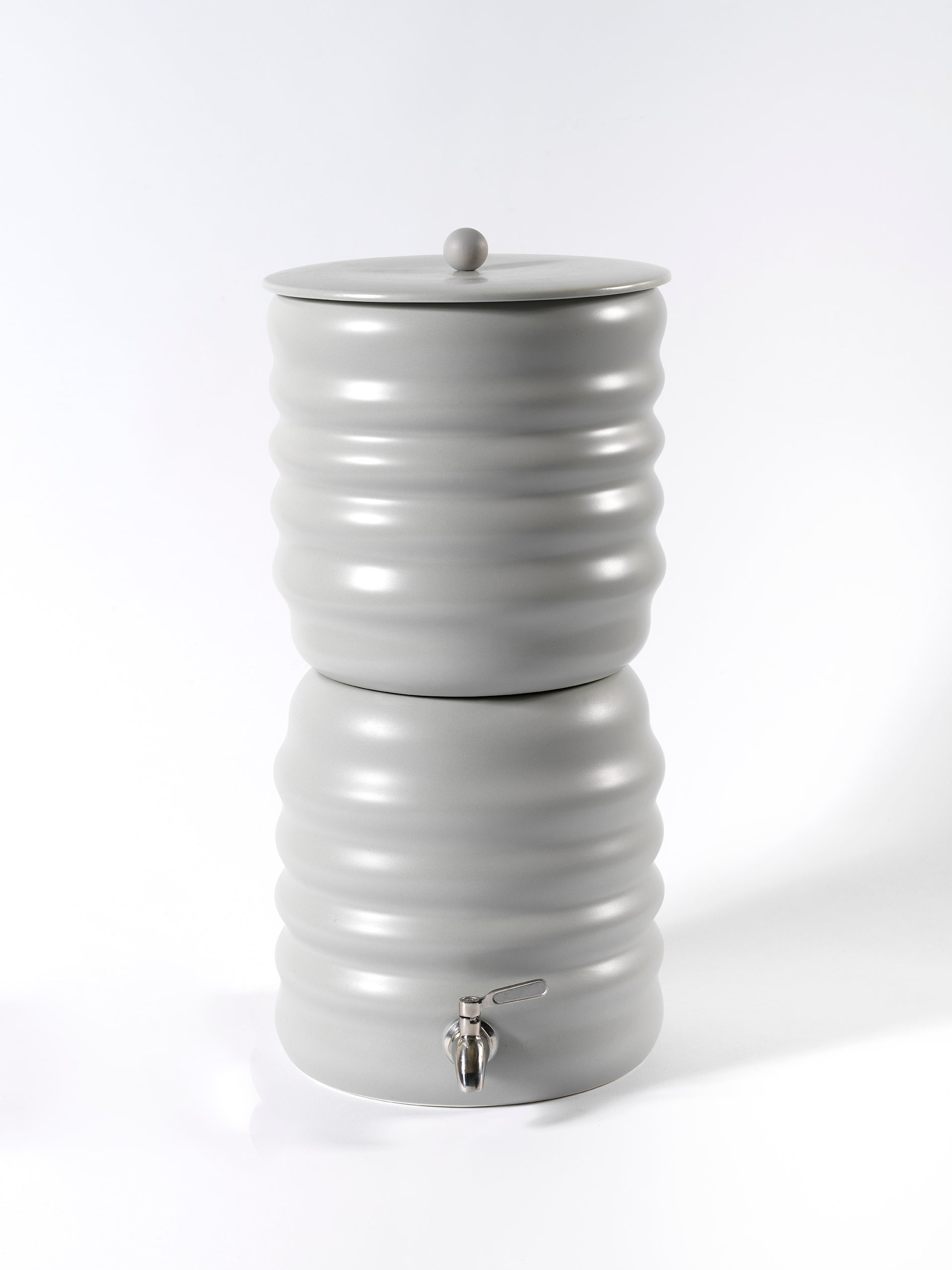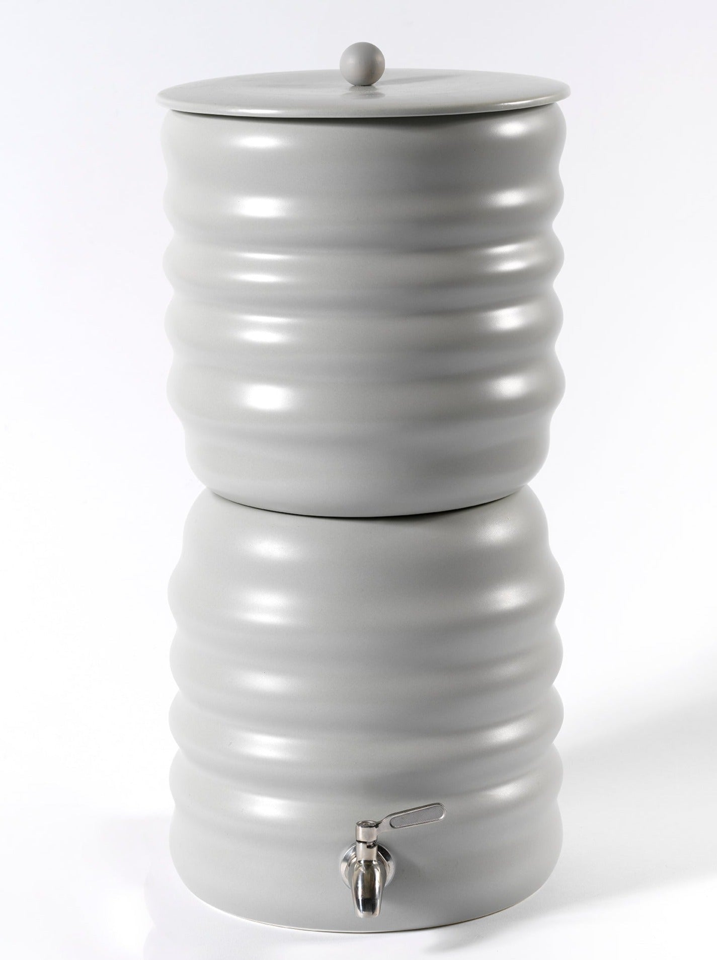 The BIG WALTERs three sections are glazed in a beautiful matte grey . A lid with a maple knob, top chamber, and a bottom chamber with a silver stainless steel spout.