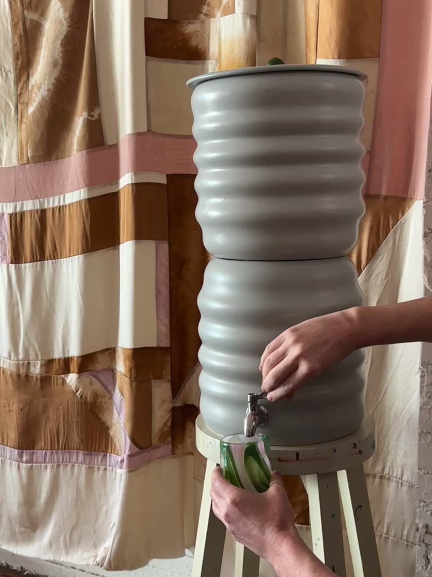 Fill the top chamber with tap water, which flows through the carbon block filters into the lower chamber as purified water ready to drink.
