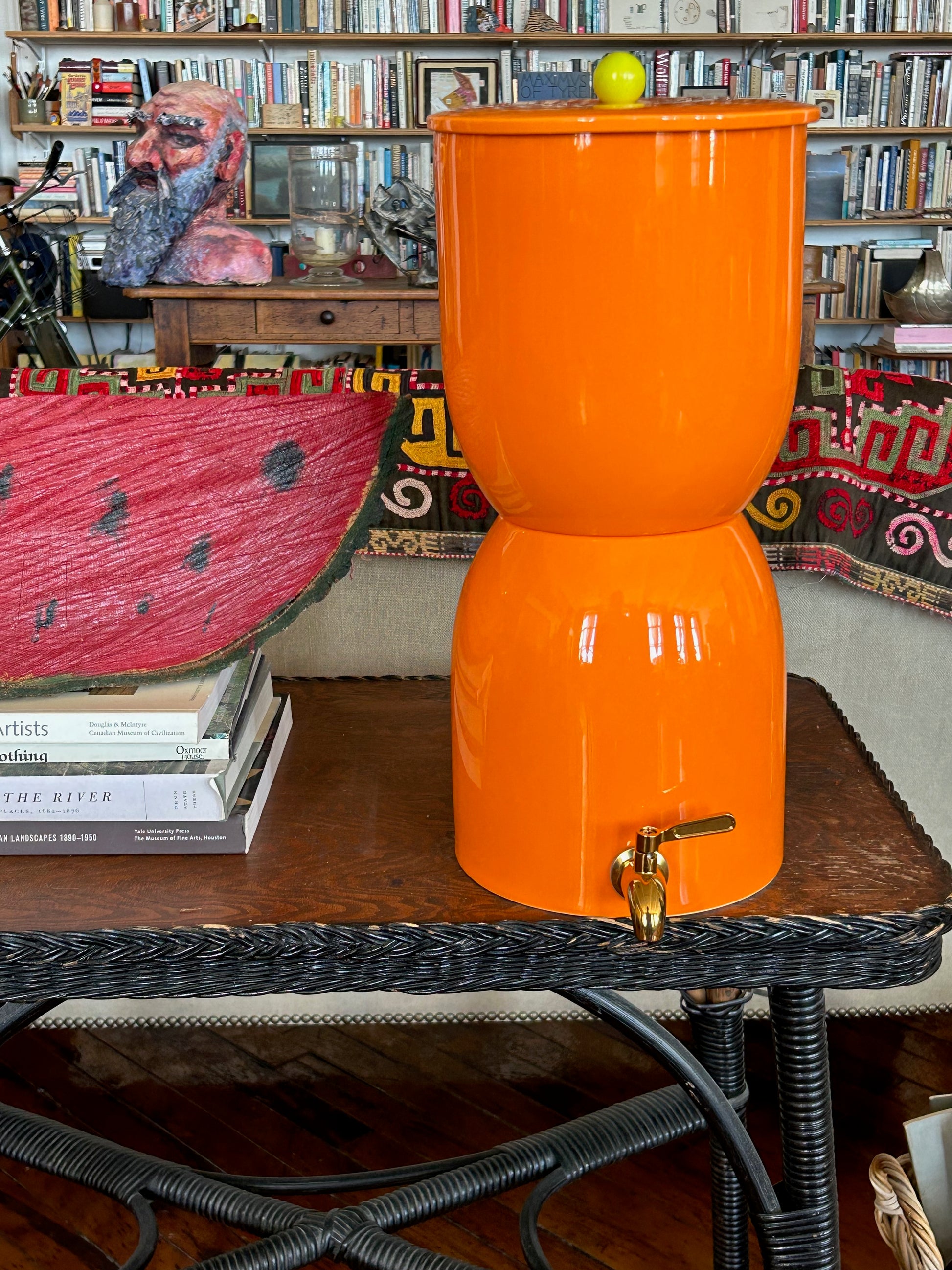 I am way too obsessed with beautifying normal, every day items in my house, but this one got the approval of both my partner and my best friend. It's not often that I hear "No yeah, you actually need to buy that." It has increased my water intake by literally just being cute. It looks amazing in my kitchen. The water tastes great. The size is perfect for 2-3 people. The brass spout is heavy duty and stunning. What more could I ask for? I thought I'd need the large Walter but the orange color was a no brainer for me and our 2 person household has no problems with the size. We paired it with the navy blue handle, and it sits perfectly on our raised counter/breakfast bar with space to fit a glass underneath. Couldn't be more stoked! Thank you for this masterpiece!