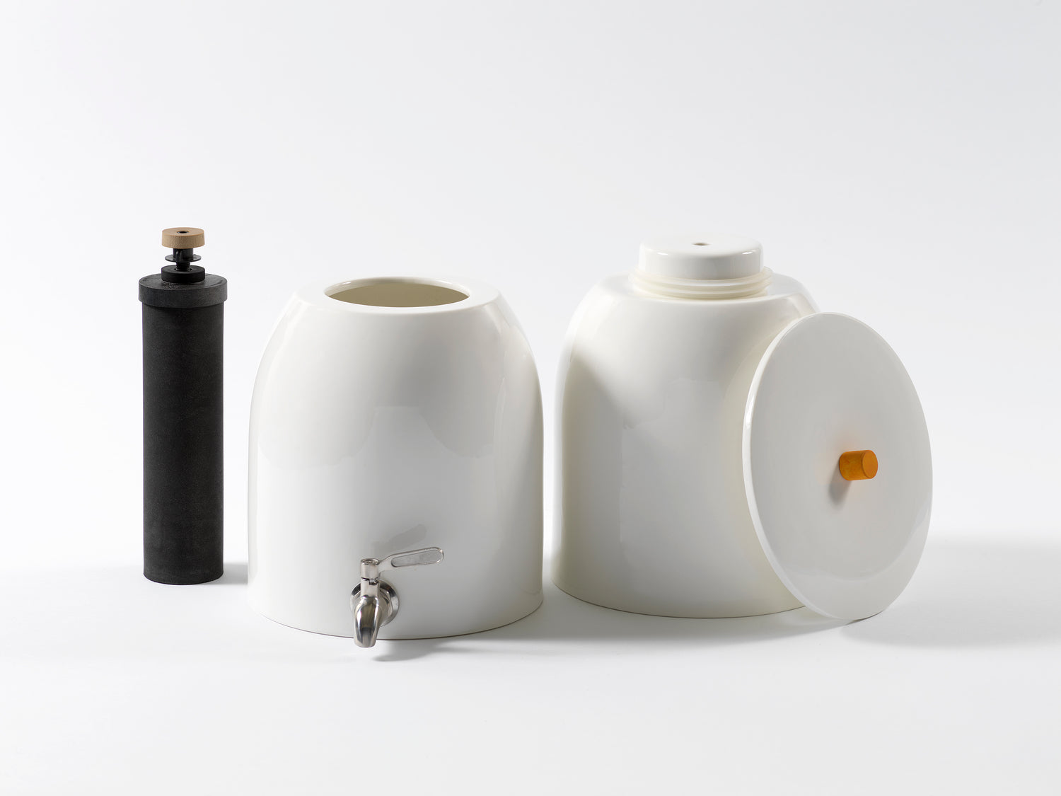 Fill the top chamber with tap water, which flows through the carbon block filter into the lower chamber as purified water ready to drink.